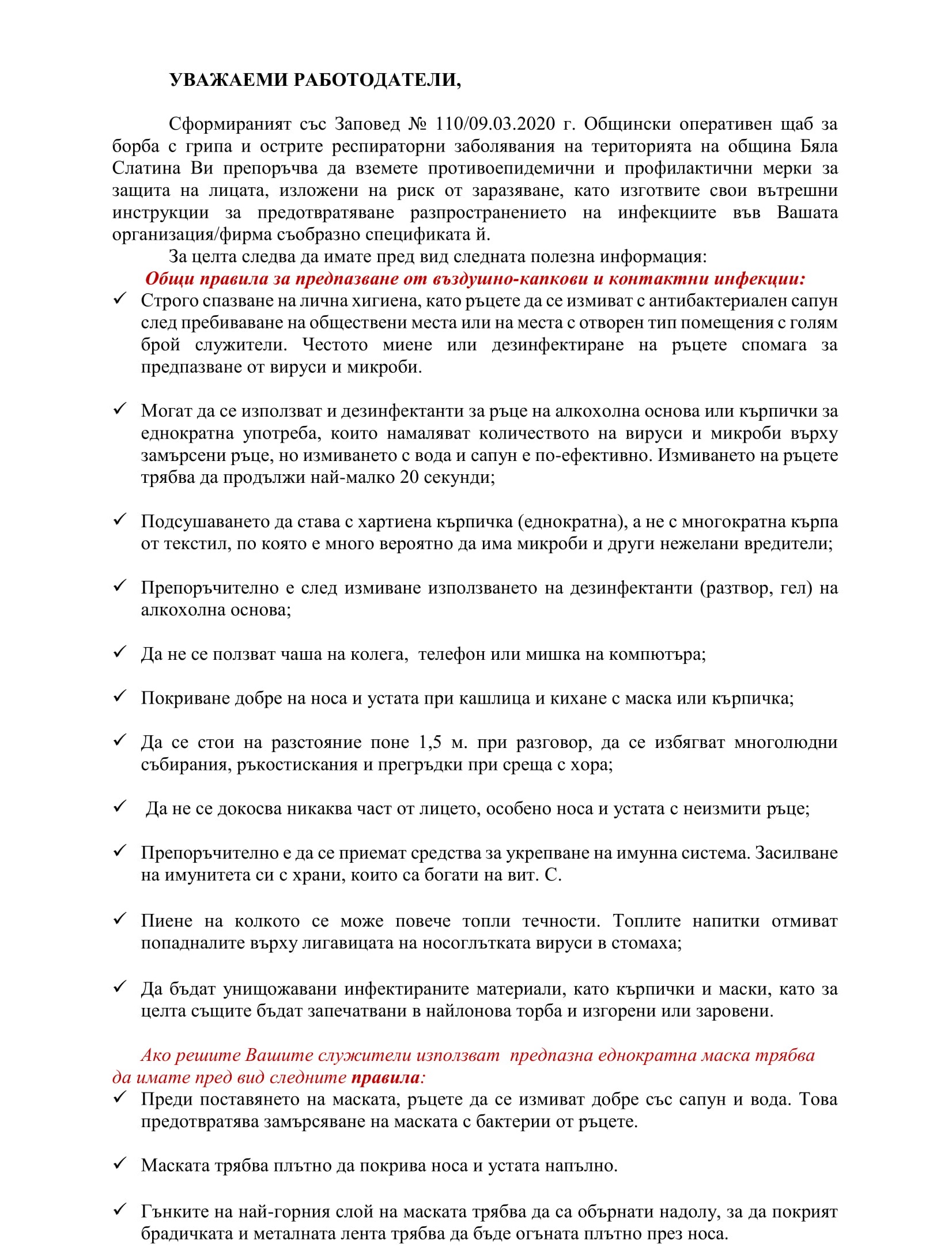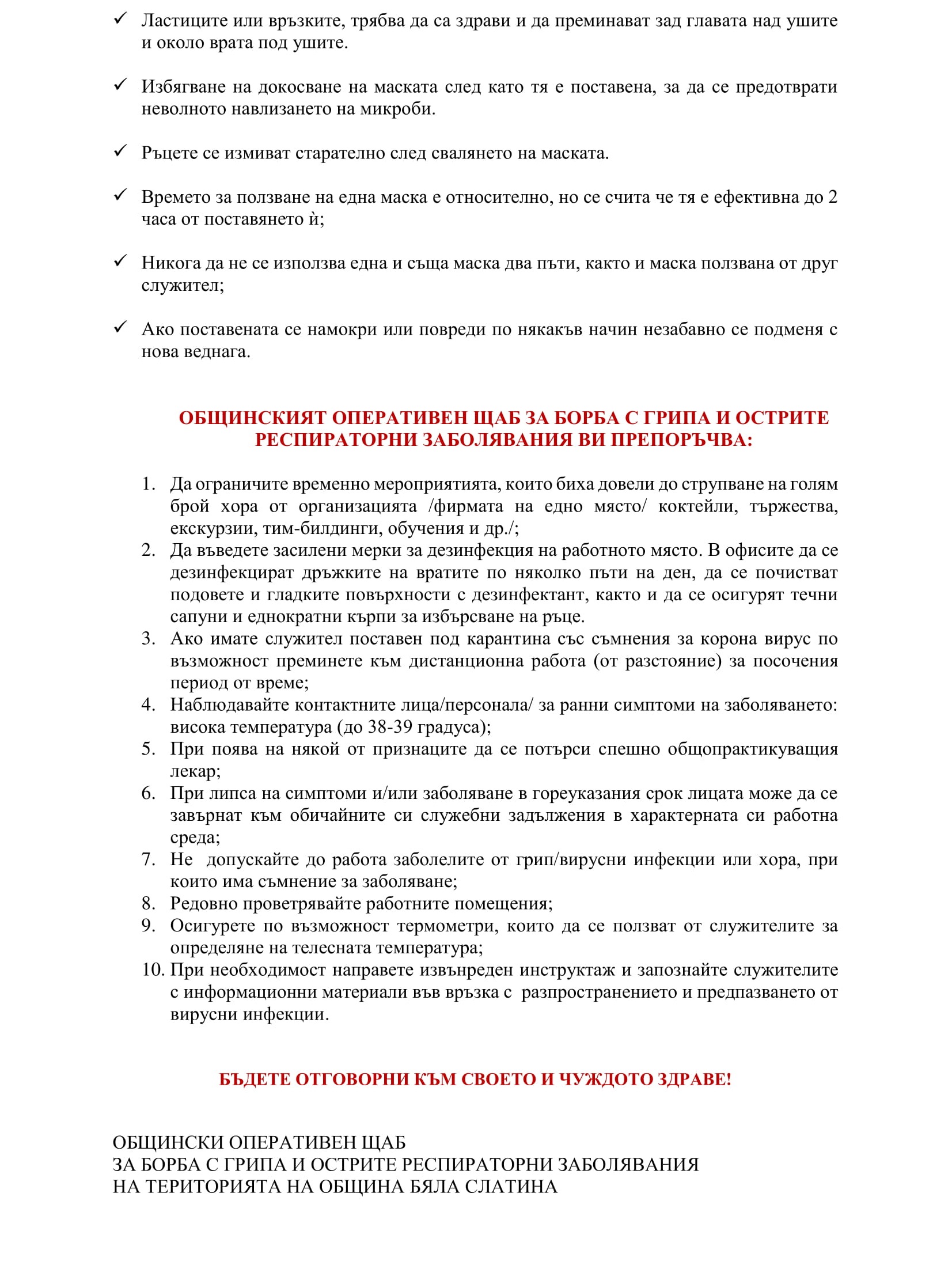 Общинският оперативен щаб за борба с грипа и острите респираторни заболявания с призив към работодателите