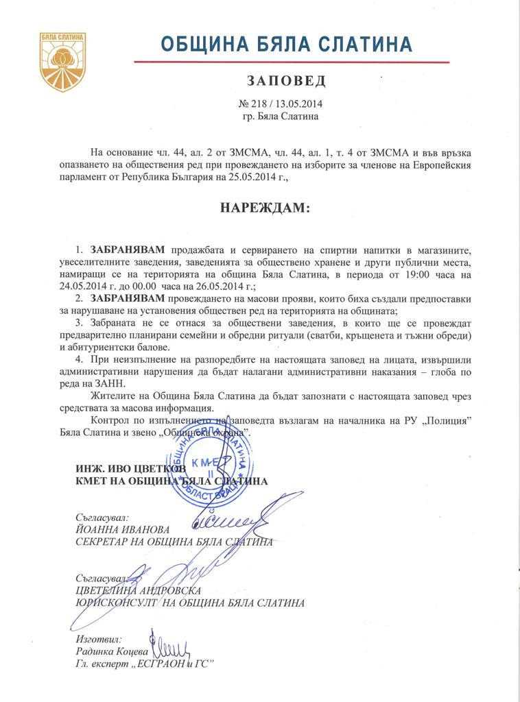 Заповед № 202 / 05.05.2014 г. Относно: образуване на подвижни избирателни секции за провеждане на изборите за членове на Европейския Парламент, на територията на Община Бяла Слатина.
