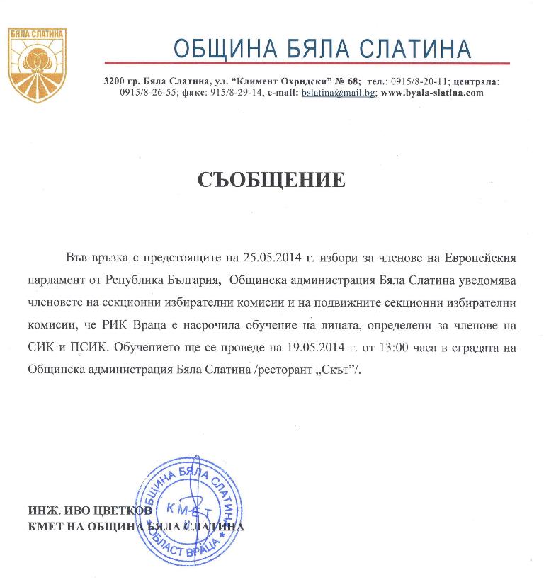 РИК Враца е насрочила обучение на лицата, определени за членове на СИК и ПСИК. Обучението ще се проведе на 19.05.2014 г. от 13:00 часа в ресторант "Скът".