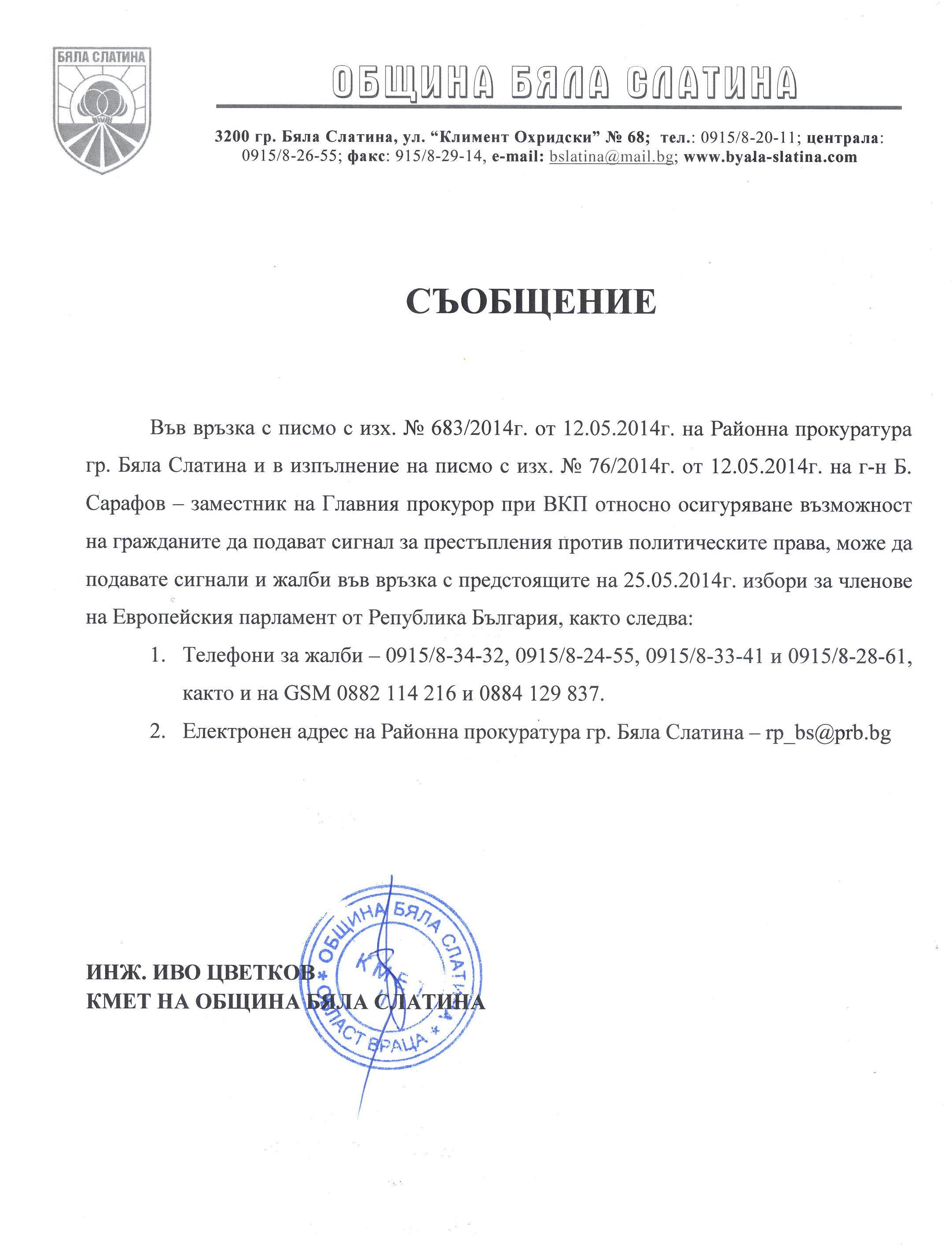 Заповед 189 / 22.04.2014 г., относно определяне на места за поставяне на агитационни материали на територията на община Бяла Слатина
