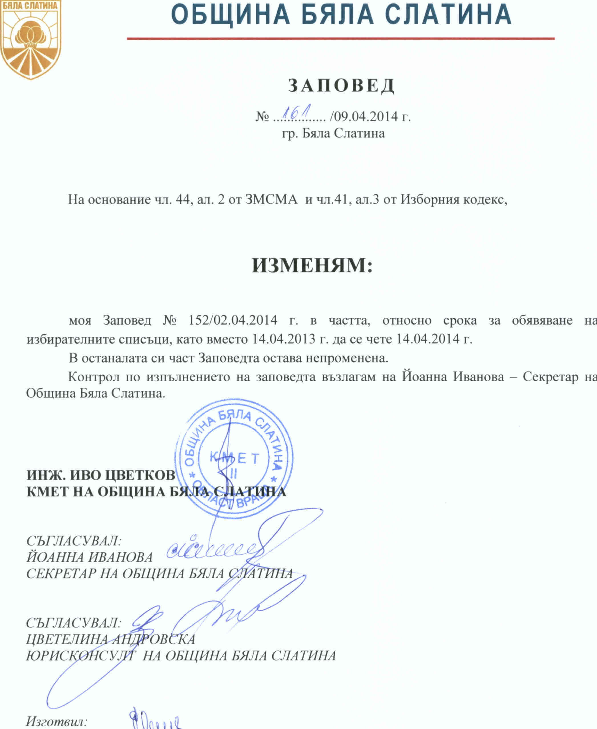 Заповед №161 / 09.04.2014 г. за промяна на Заповед 152 / 02.04.2014 г.